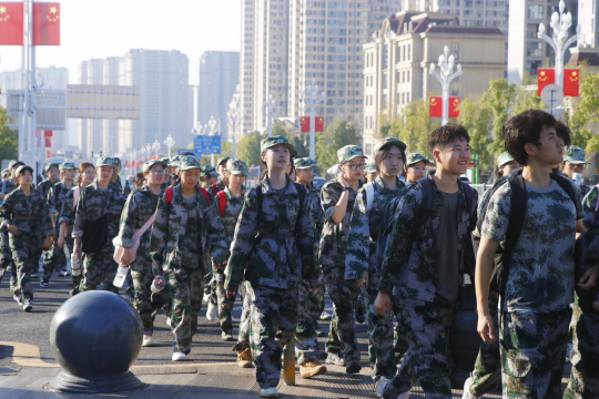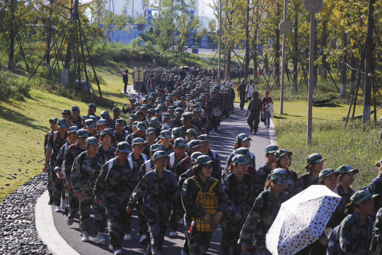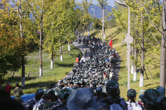 在田径场集合整队完毕后,同学们在教官、老师的带领下慢跑至达州巴山大剧院广场处稍作调整,随即开始了在莲花湖湿地公园10余公里的拉练之旅。