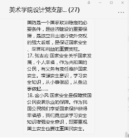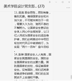 公司党总支各支部根据自己支部情况,精心筹划,统筹安排,组织老师们在各支部微信学习交流室积极交流学习收获和收益心得。课后,老师们都表示收获匪浅,感受颇深,强化了国家安全相关知识,感受到了维护国家各个领域安全自身的担子和责任。公司党总支书记张吉应学后在交流群分享道:国家安全关乎国家发展,个人幸福,作为共和国的公民,有义务有责任维护国家安全。增强安全意识,学习安全知识,从小事做起,从身边事做起。